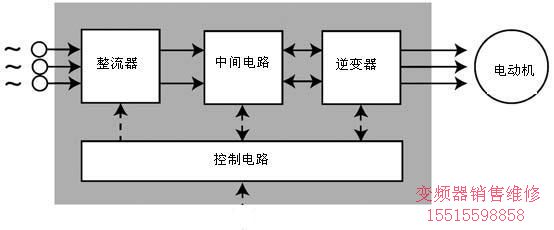 變頻器是把工頻電源(50Hz或60Hz)變換成各種頻率的交流電源,以實現電機的變速運行的設備。如圖1所示,其中控制電路完成對主電路的控制,整流電路將交流電變換成直流電,直流中間電路對整流電路的輸出進行平滑濾波,逆變電路將直流電再逆變成交流電。對于如矢量控制變頻器這種需要大量運算的變頻器來說,有時還需要一個進行轉矩計算的CPU以及一些相應的電路。